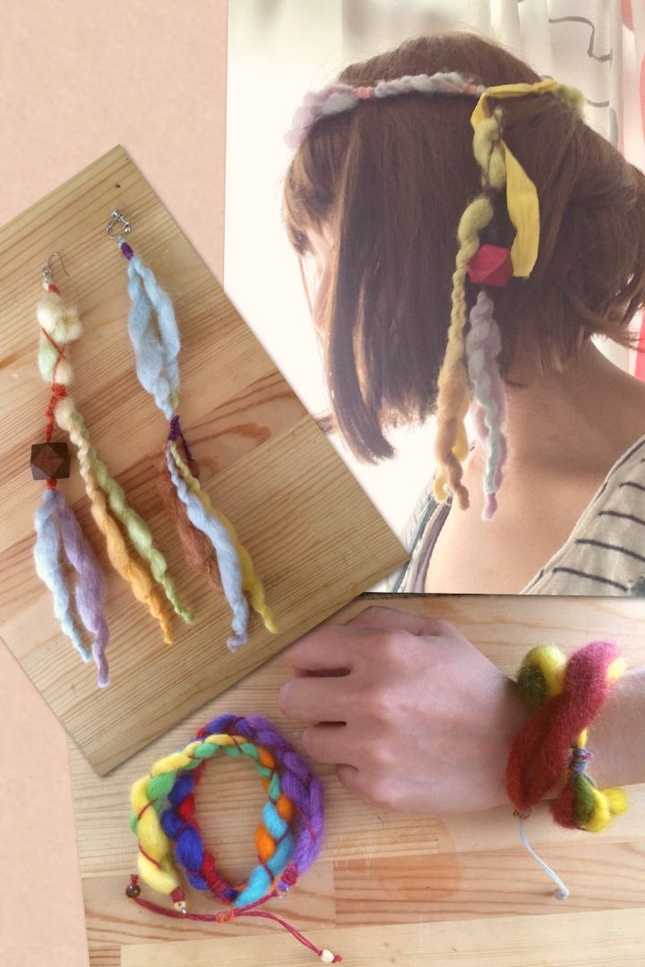 ロウ引き紐を使った毛糸アクセをたくさん持っていきます◎
